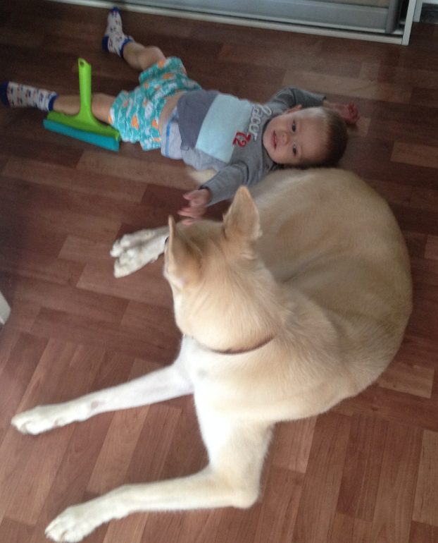 Эти двое по-прежнему неразлучны) Тимур теперь его и седлает, и за ошейник таскает, даже приносит поводок и пытается надеть его Лексу, даже вот так ложится на него и лежит, отдыхает) А Лекс что, он терпит, смирился уже))