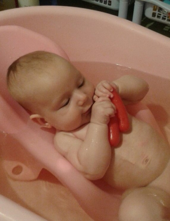 купаться как и раньше обожаем, но теперь нужно что-то взять в руки, например пластиковые сосиски)