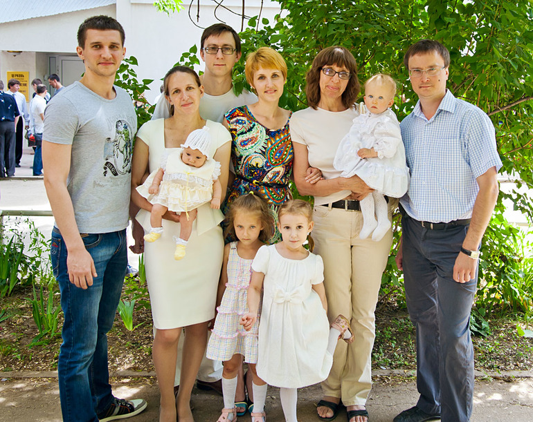 слева на право: мой младший брат Стас, я, на руках дочь Ярослава, мой муж Никита, моя младшая сестра Маша, наша мама, на руках племянница Василиса, муж сестры Алекей; внизу - племянница Варвара, на одной ноге - дочь Кира)))