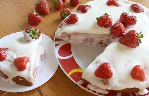 На нижний корж выкладываем клубнику. Большие ягоды разрезаем на половинки. Сметану взбиваем с сахарной пудрой и полученным кремом заливаем клубнику. Накрываем вторым коржом - сверху оставшуюся сметану и пудру. Украшаем ягодами. Даем час-другой пропитаться(лучше в холодильнике).