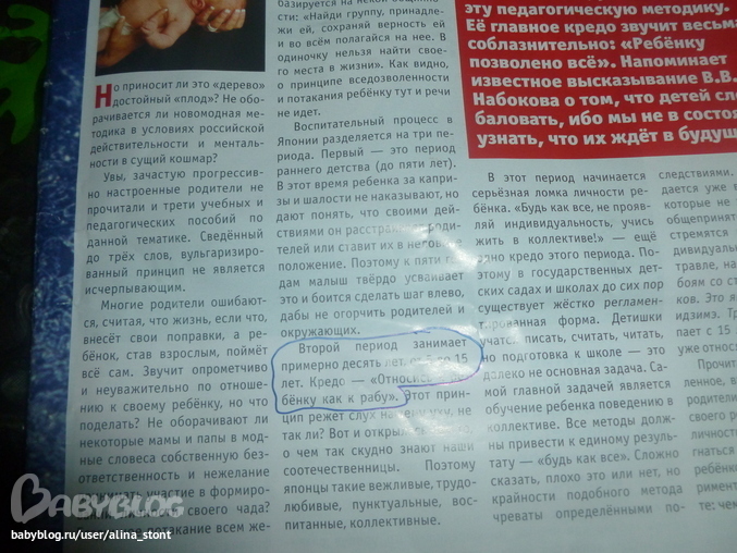 2. Период занимаем примерно 10 лет, от 5 до 15. Кредо - "Относись к ребенку как к рабу". Этот принцип режет нам слух. Вот и открылось нам то, о чем так скудно знают наши соотечественницы. Поэтому японцы такие вежливые , трудолюбивые , пунктуальные, воспитанные и коллективные.