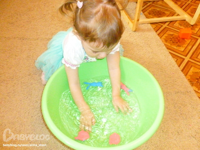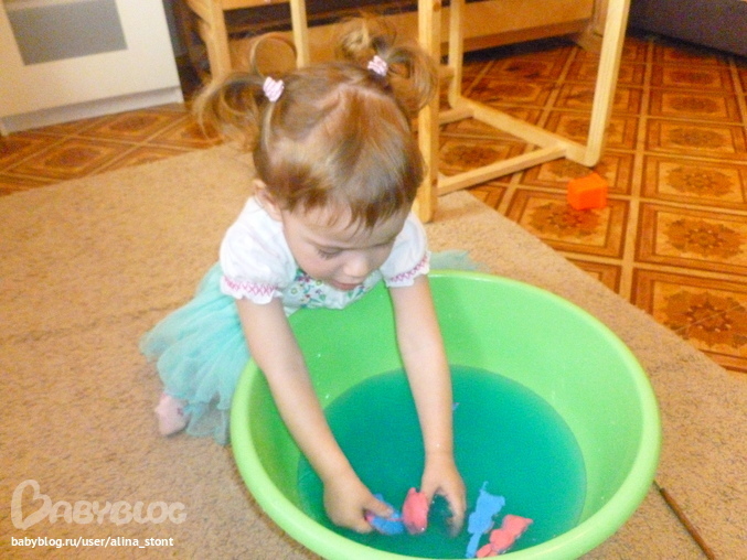 Когда окрасили водичку, стало веселее и ребенок дольше возился с не потерявшими пока еще форму животными.