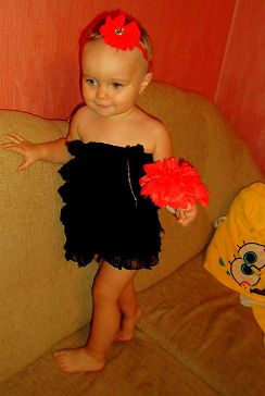 Мне цветочек в волосах и на ручке нравится. Сочетание цветов классическое - красное с черным, а вот платьице очень взрослое.