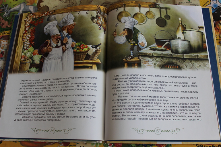 Наконец этот день настал, совсем неожиданно для меня на полке нашлось не так много книг в которых кто-то что-то готовит, гораздо больше иллюстраций с чаепитием, богатыми красиво сервированными столами. Для начала давайте заглянем в гости к Карлику носу, и оценим уровень его кулинарного мастерства!