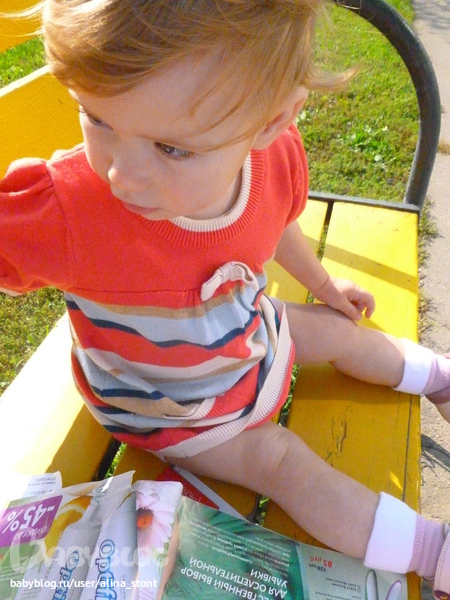 На улице сегодня солнечно,но ветренно!Однако нам не помешало рвать цветы с корнем,гояться за голубями и бегать по песку,держа маму за руку,залазить на грязную горку и кричать на всю детскую площадку))Приходим мы домой,она на соску показывает пальцем(обычно раскидывает вещии ползает) потом доползла до кроватки и тянет одеяло на себя,я поняла что она спать хочет,я пока желание ее не пропало,укутала и все вырубился ребенок,удивило то,что она сама захотела спать,обычно я ее когда с прогулки приходим кормлю потом укачиваю,а тут она САМА захотела!!!! Взрослеем ура!!!