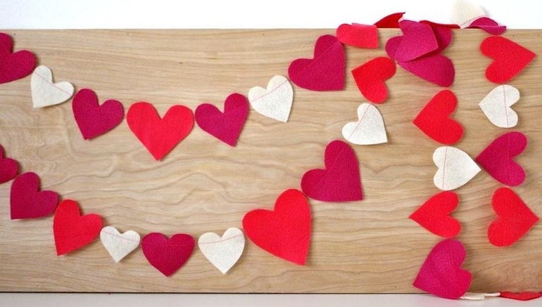 Дочь, придя из школы, заявила, что хочет сделать что-нибудь красивое в свою комнату ко "дню любви" (так она его называет). Времени у меня было совсем немного. Нужно и ужин успеть приготовить и прибраться немного, а время уже приближалось ко сну... Ну и недолго думая, я пошла рыться в своих закромах, где и нашла кучу обрезков разноцветного фетра (остался с тех времен, когда шила мягкую книжку младшему ребенку). Вот и решили мы сделать гирлянду из фетровых сердечек. По типу такой: