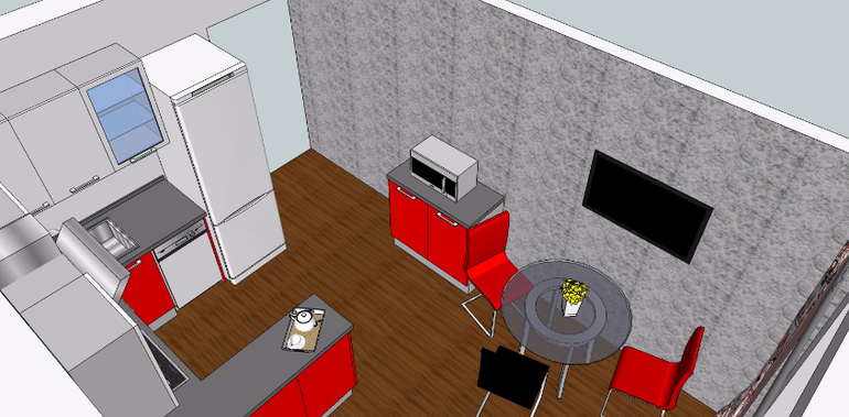 А сейчас представляю вашему вниманию эскизы кухни-гостиной для моей подруги. Задача была вместить на кухню полноценный диван и при этом учесть наличие в кухне техники (посудомочной машины, микроволновки, духовки, варочной). Вот что получилось ))