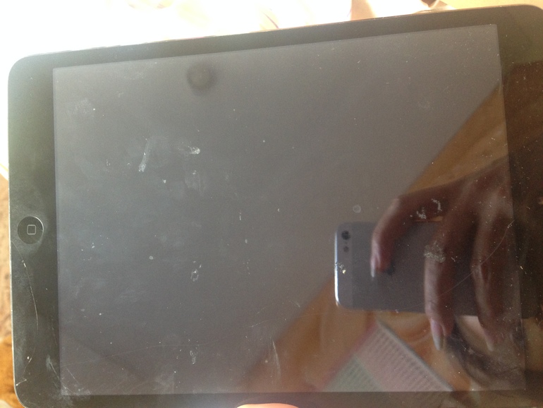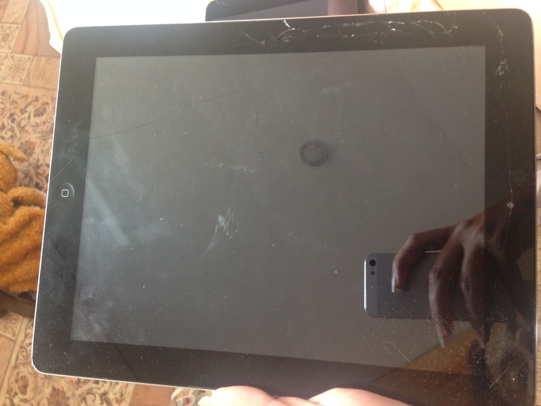 Большой раздавила когда постель Алискину застелила. Он на постели лежал, я его аккуратненько на пол положила с кровати и ....! Это Алискин айпад. А Алинкин маленький уронила с кухонного стола. Но маленький просто трещину дал, а большой прям рассыпался