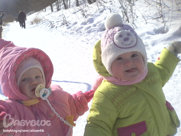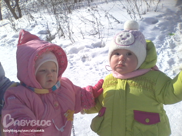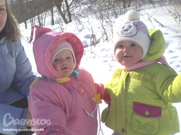 Гуляли с девочкой, с которой рожали вместе в роддоме. Потом они стали ходить ножками по снежку и Лизунька тоже захотела, закатила мамке истерику)) мол не хочу больше в коляски, вот и стали мы тож ходить. Конечно в одежде им оч тяжело)))) дома-то мы просто летаем уже.))) Было оч забавно, дети разговаривали как-будто понимают друг друга и хохотали))))))