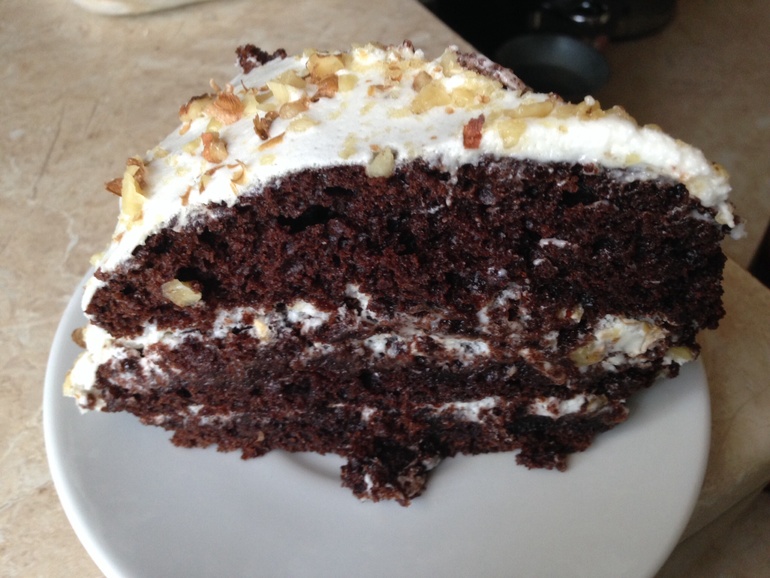 - Промазать коржи кремом, просыпая орешками для приятного хруста, украсить шоколадом