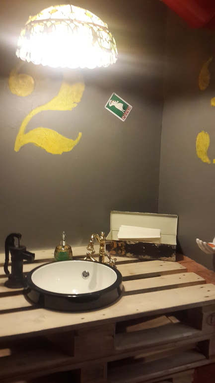 Необычно! В ресторане Горохов в Питере вместо раковины установлено реально деревянное корыто)))) Аксессуары латунь и прочее в стиле лофт очень ему импонировали!