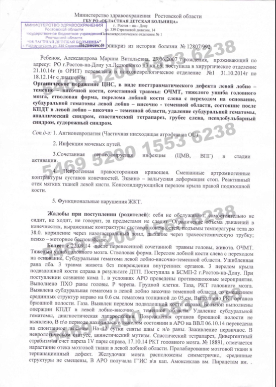 К огромному сожалению, в жизни не все складывается так, как мы хотели бы. 22 сентября 2014 года в Ростове-на-Дону произошла страшная авария, травмы получили Марина, ее брат и папа, но больше всех пострадала сама девочка. Она пережила сложнейшую операцию, полтора месяца пролежала в коме и до сих пор остается в тяжелом состоянии. На сегодняшний день диагноз - апаллический синдром (бодрствующая кома).