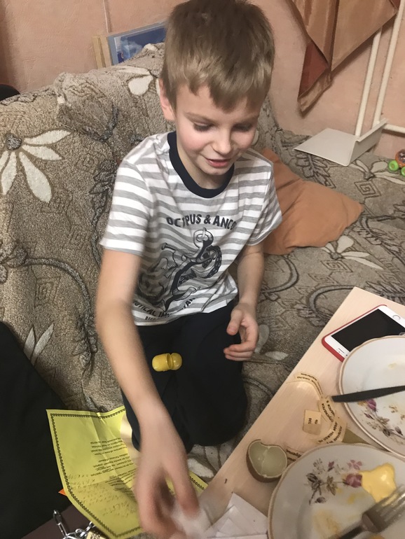 6. В диване надо было найти клад - это киндер-сюрприз, внутри которого следующая подсказка: разрезанная на части загадка про унитаз.