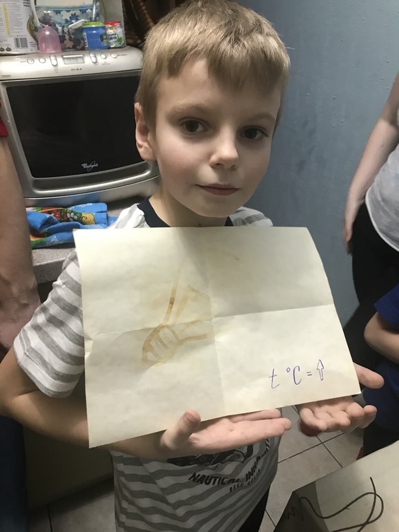 4. На плите был листок, на котором молоком нарисована подсказка. От нагревания подсказка проявляется - лампочка.