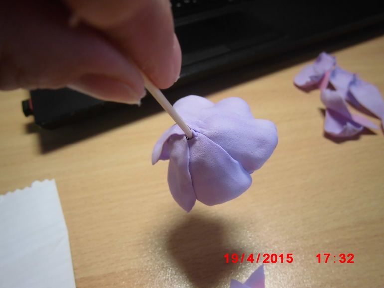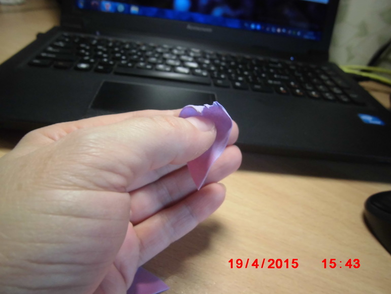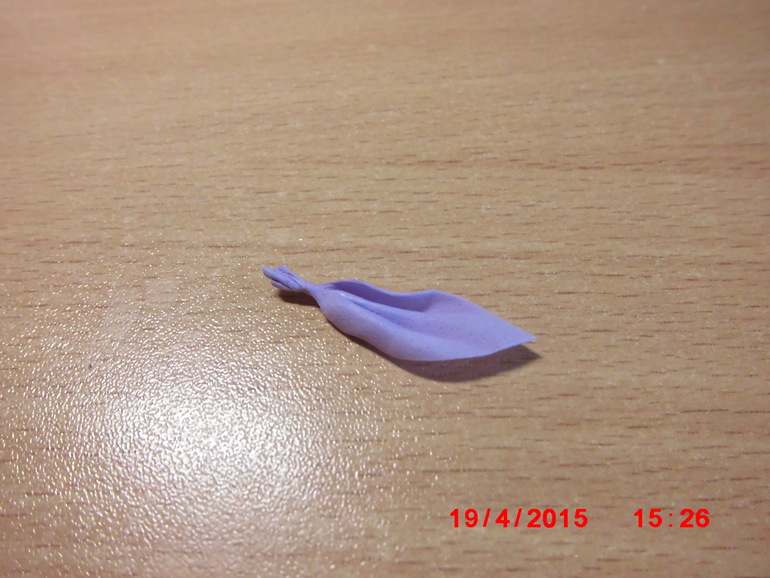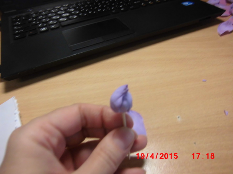 Дальше , большой палец ставим в середину лепестка , а другой рукой вытягиваем конец лепестка, только аккуратнее, чтоб не порвать