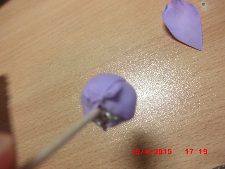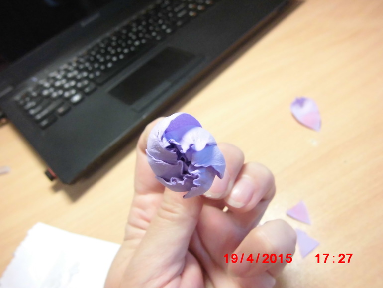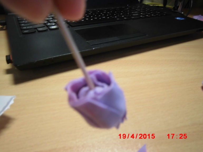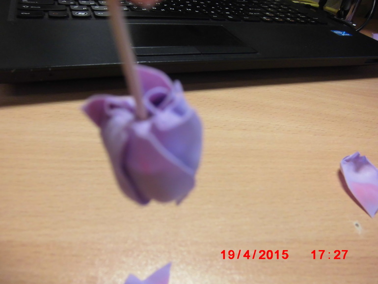 Дальше берем наш бутон и оборачиваем аккуратненько его заготовкой , нанося клей на первый лепесток , гдето в серединке при обертывании , и на последний