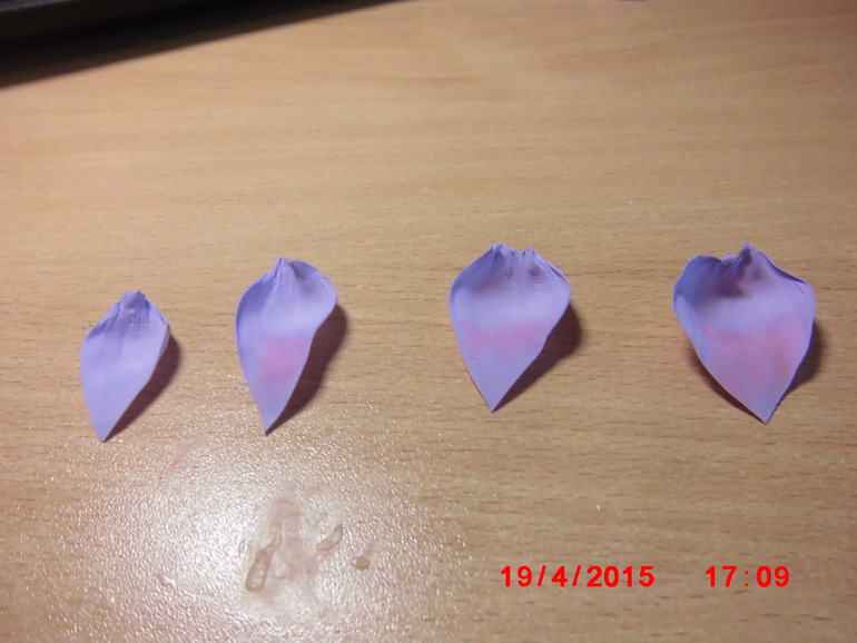 Перенесли, вырезали и начинаем придавать форму каждому лепестку . Нагреваем лепесток на утюге, складываем гормошкой и растираем между пальцами