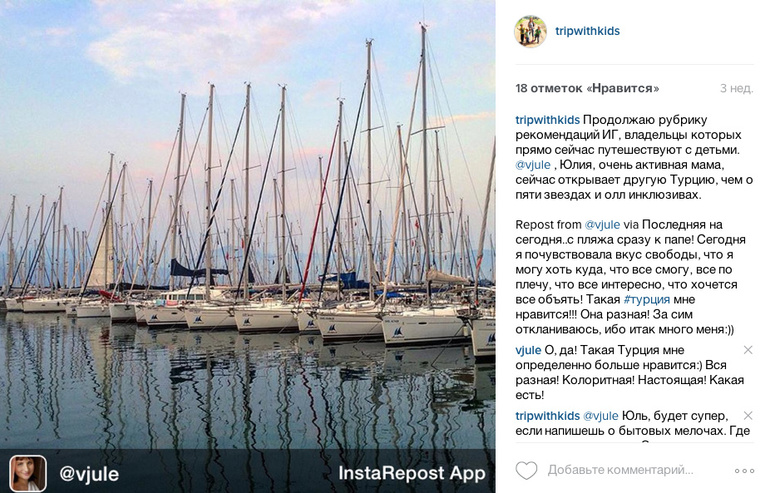 Для того, чтобы в @TripWithKids я сделала репост вашего поста о начале путешествия, то стоит рассказать о нем и отметить мой профиль в тексте. Тогда я смогу видеть и репостнуть. Подписчики @TripWithKids, кому интересно это путешествие, подпишутся на ваш аккаунт. Все просто!