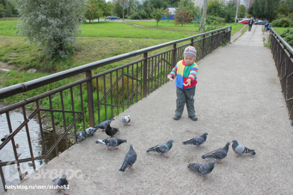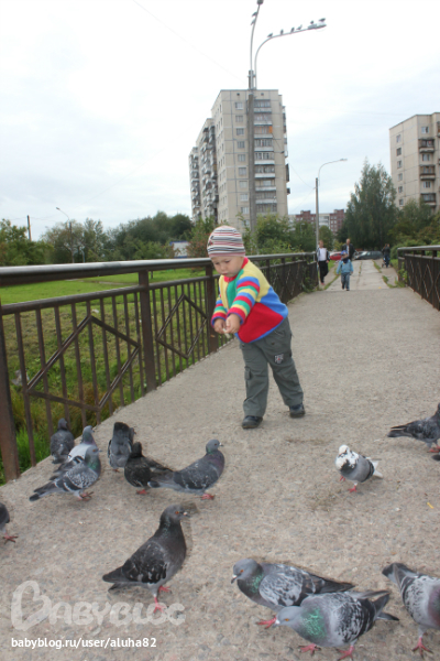 Потом мы поднялись обратно на мост и решили еще голубей покормить. Славеныш так развеселился и кричал им:"Эй, давайте! Вон она, там лежит!"