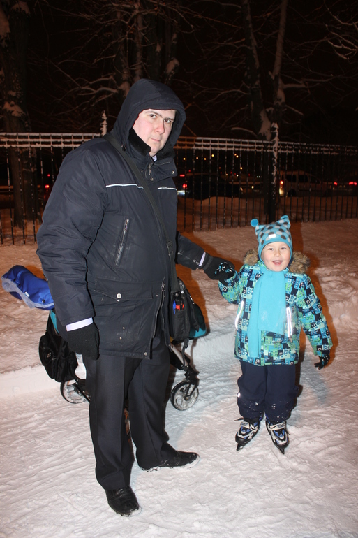 Прогулки!После бурных выходных о которых расскажу чуть позже мы вчера после того, как наш папочка приехал с работы отправились на каток. Каток у нас огромный, расположен на улице... вход всего 130 руб. и катайся хоть целый день... Столько времени у нас конечно нету, но все-таки... Сначала мы учили кататься на коньках Славика. Тяжело когда нету вот таких поддерживающих игрушек, как в крытых тц. Поэтому с мужем чередовались. Но я сделала вывод, что пока Славу выводить на такой лед не то что бесполезно, а тяжело. С игрушкой он уже так хорошо стоял на коньках, а тут ножки разъезжаются... Попадали конечно... Хорошо, что не сильно. Да что там говорить, я сама вначале еле стояла на коньках. Лед здесь оказался лучше чем когда мы ездили кататься в тц. Он реально более скользкий, а может потому что коньки у меня новые. Ведь я их так и не обкатала...