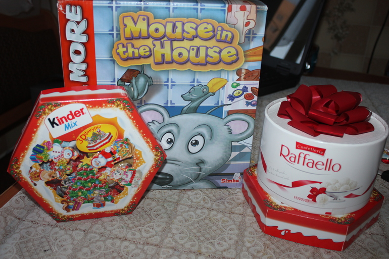 Славик получил в подарок настольную игру.... "Мышки в домике". Игра очень хорошая. заказывала ее я, т.к. родители сами попросили. Играли уже несколько раз. Она такая клевая. Славику понравилась очень. Уже и со мной несколько раз поиграл и с папочкой и даже бабушку уже успел усадить. И сладости конечно... Ох сколько же их.. Эти сладости.. все дарят и дарят... На целый год хватит...