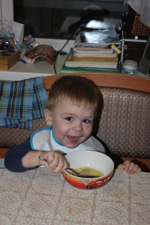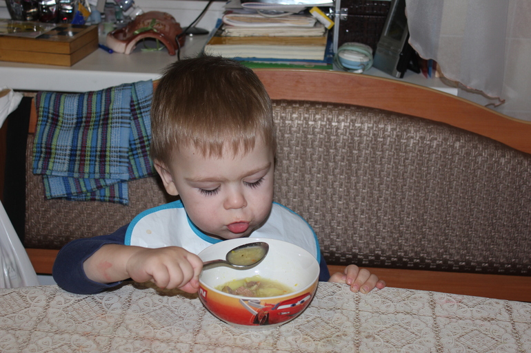 Кушает Темочка только за большим столом. За маленький столик даже не пытаюсь уже сажать, там мы только рисуем, лепим. Всегда всем заглядывает в тарелки, чтобы увидеть кто что кушает. Любопышка.