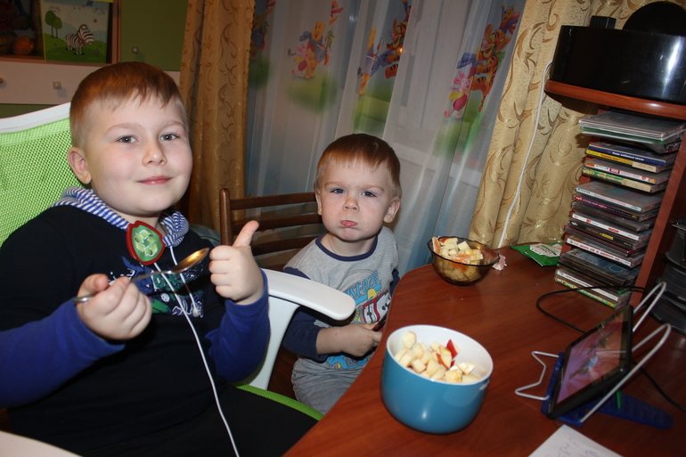 Вот так с фруктовыми салатиками смотрят мультики. Темик начал по чуть-чуть смотреть мультики. Маша и медведь может занять на какое-то время, ну или если Слава что-то смотрит, то и Темка заглянет.