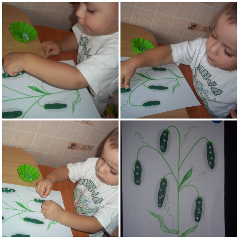 И творчество, сегодня был такой восторг у Макса. я ему только показала бусины. он уже был счастлив, у него особая любовь к бусинам, пуговкам и ниткам. Я заранее сделала заготовку гороха, а Макс уже сам раскладывал горошины. Умничка, очень старался, да и получилось отлично.