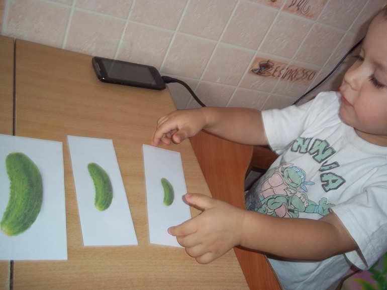 Повторили понятие "большой-маленький", на настоящих огурцах, мы выбрали только большой и маленький (было только два), и на картинках разложил все правильно.