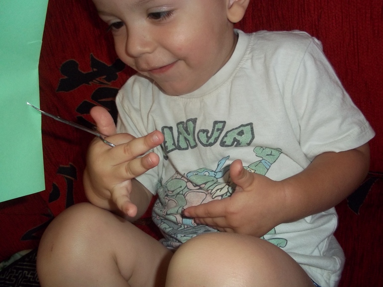 Сегодня первый раз разрешила резать ножницами, резали мы травку, чтобы кузнечик смог спрятаться. Получалось конечно не очень, листик я держала сама, тк.к сам не справлялся, но для первого раза неплохо (остался доволен)