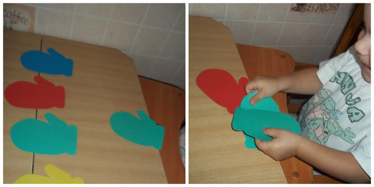 Еще одно задание, найти пару зеленой варежке, сразу же выбрал правильно.