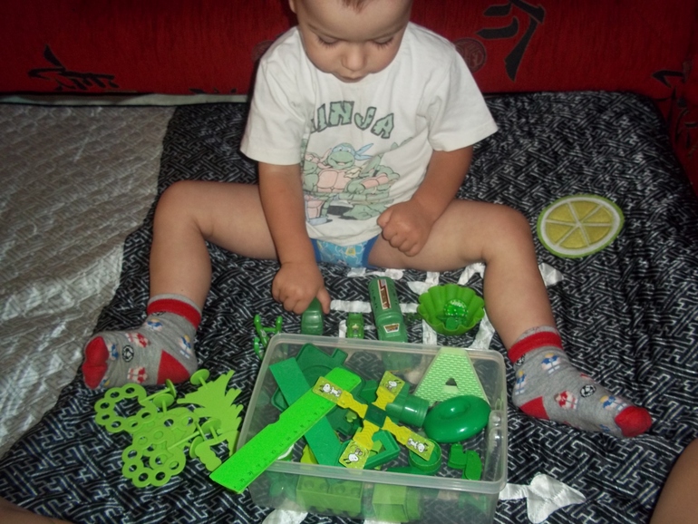 и завершили все зелеными игрушечками. Макс сам играет с ними и придумывает мини-игры))). Вечером попросил опять "мама дай зееную каебку". Значит цвет запомнил))