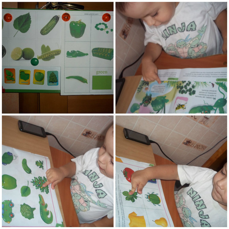 На сегодняшний день мы были в белой маечке с зелеными черепашками-ниндзя, пользовались зелёным горшком (это у нас второй по счету, первый тож был зелёный), кушали из зелёной тарелочки и пили из зелёной чашки, кушали огурчики (точнее надгрызали, а потом маме), на прогулке считали зелёные автобусы (большая часть городского транспорта у нас зеленого цвета), рассматривали зелёные листики и травку. В общем зеленого было много.