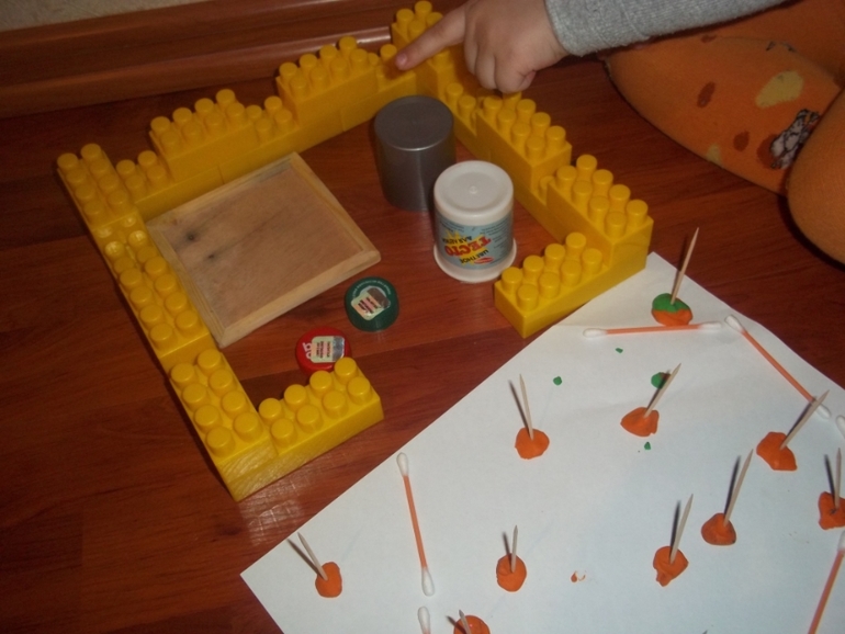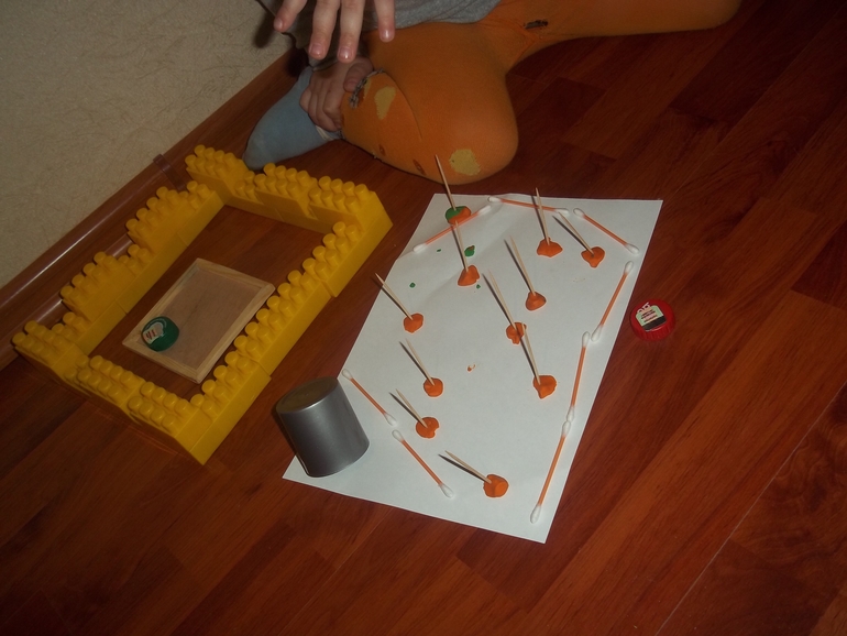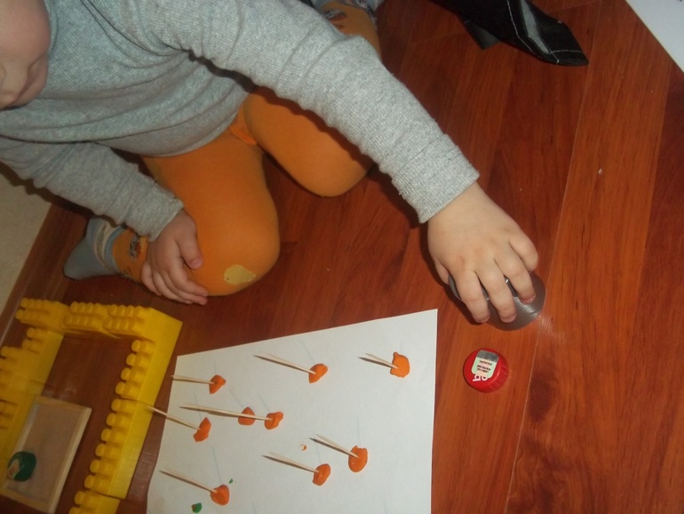 В качестве баночки с маслом мы использовали 8 баночек из-под пальчиковых красок, нужно было разложить в низ пуговки по цветам и закрыть крышечкой соответствующего цвета. Справился отлично.