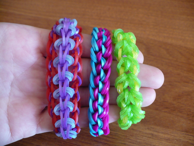 Дочь моя вообще никак не увлекалась рукоделием. Никаким. Увлечения у неё немного мальчишеские: занимается каратэ, на велике, роликах, самокате катается (и даже пытается делать трюки), плюс в хоккей зимой играет (никакого фигурного катания!). Но вот появилась новинка - Rainbow loom. И дочь моя начала плести. В школу тоже таскает и резинки и станки. У нас почти все наборы есть и резиночки ей постоянно покупаю. Сама ищет в интернете видеоуроки и плетёт. Иногда не получается, тогда приходит ко мне, плачет, жалуется, а потом успокаивается и убегает плести заново. Упорная она у меня. Иногда по несколько дней тратит на браслет или фигурку, но упорно начинает снова и снова. Покажу самые удачные поделки.