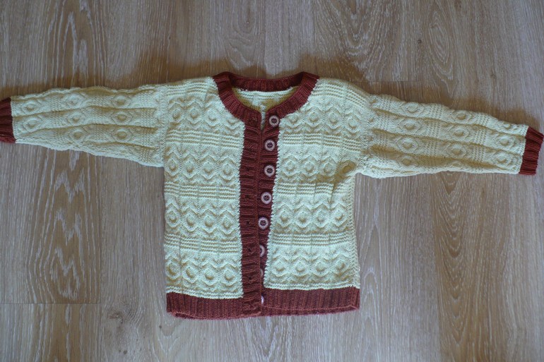 Связала Оле кофточку для прогулок в прохладные дни. Пока вязала - намучилась. Выбрала же очень объёмный узор и поняла в процессе, что пряжи мне не хватит. Купить такую же уже не смогла, и пришлось мне часть работы распускать и вязать другим цветом резинку и планки. Оля, глядя на это, спрашивает меня: "Мама, ну почему нельзя просто купить в магазине кофту?". На что я ей и ответила, что эта кофта будет связана с любовью и заботой о ней, и она точно согреет в холодную погоду. Так что теперь Оля так и называет её: кофточка, где каждая петелька связана с любовью.