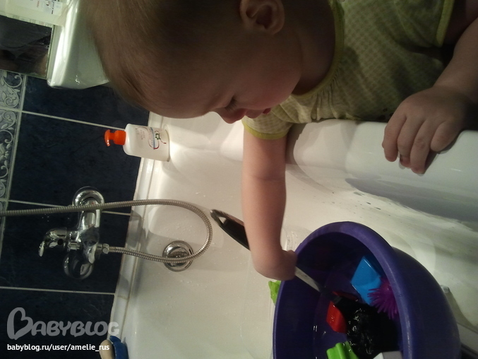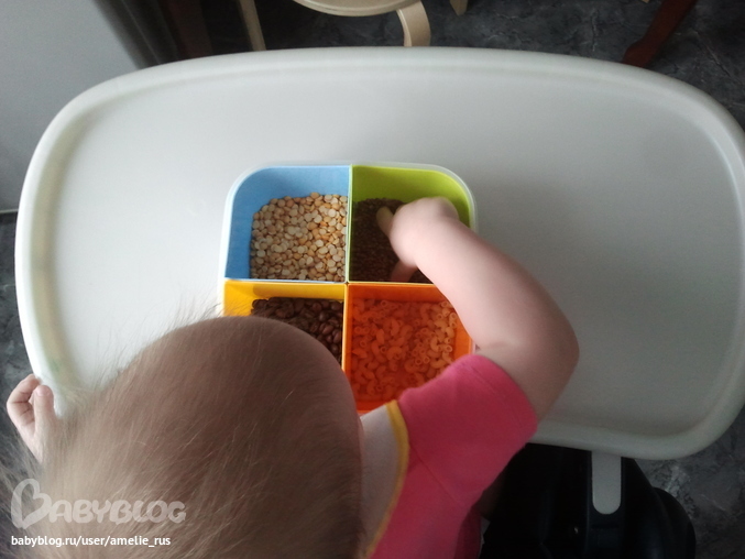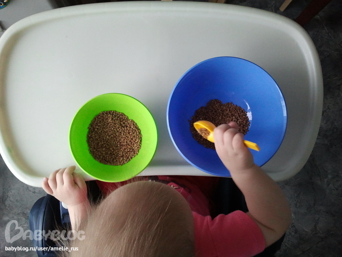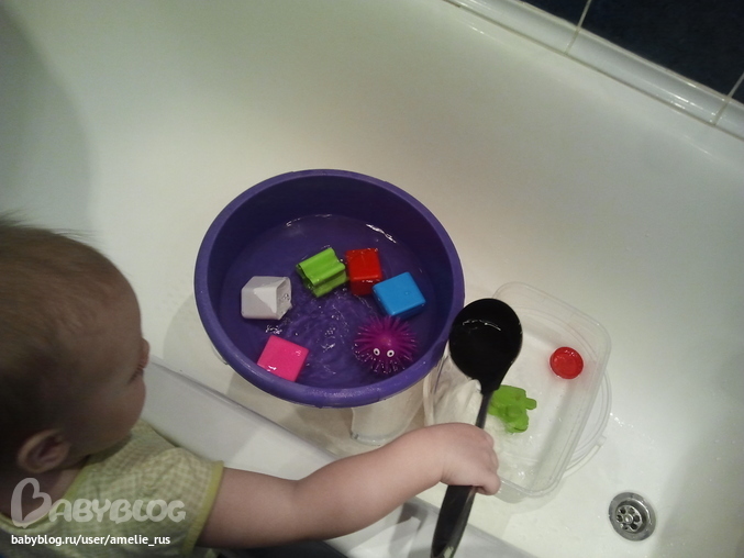 перекладывали половником игрухи из тазика с водой в коробочку. первый раз это увлекло восторженную дочку на полчаса, потом минут на 5, но ей нравится.