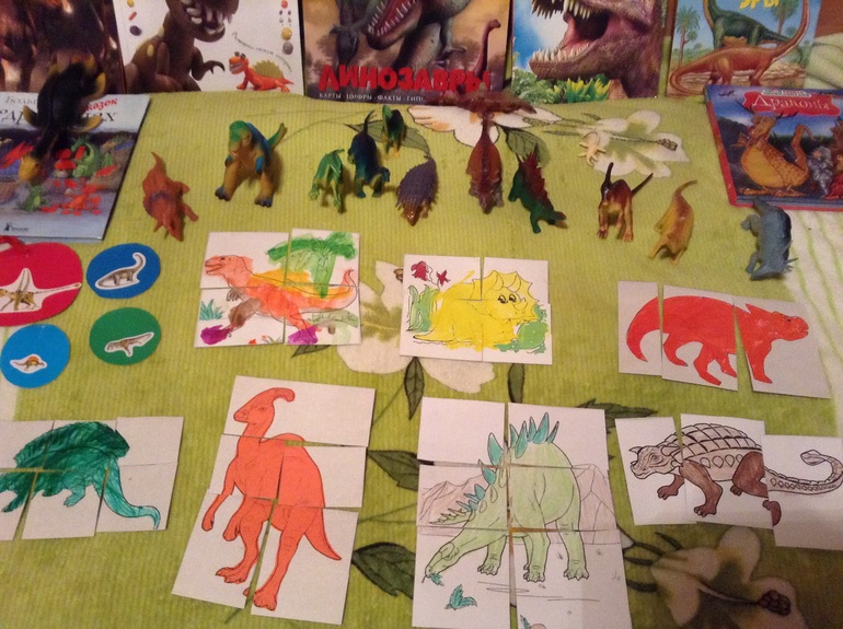 Эти пазлы я сделала из Магиных рисунков, ну и парочку сама раскрасила. У Алины эти пазлы с 2 лет самые любимые, может потому, что после того как собрал пазл получаешь медаль с изображениям этого динозавра.