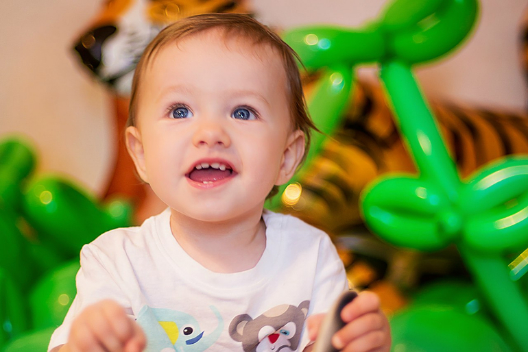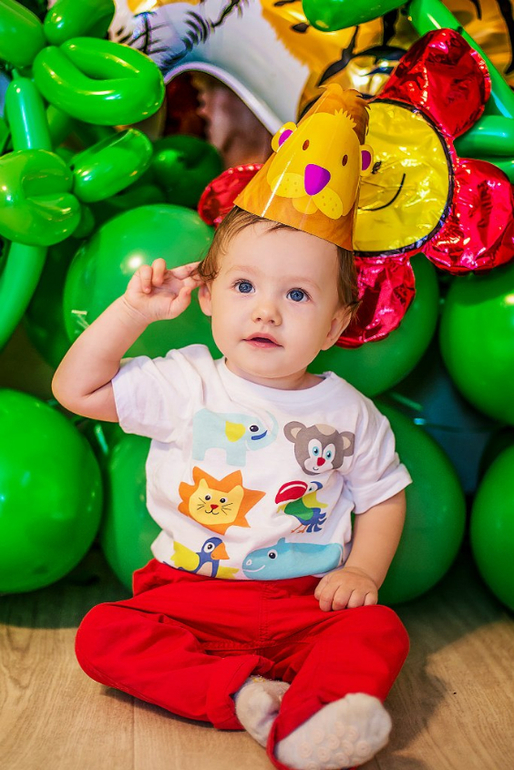 Именинник увидел подарки и украшение в ночь на день рождения, ведь родился он в 01-09 ночи, дождался этого времени и только тогда улегся спать. Мы с папой подарили ему домик в джунглях, а внутри домика были подарки)