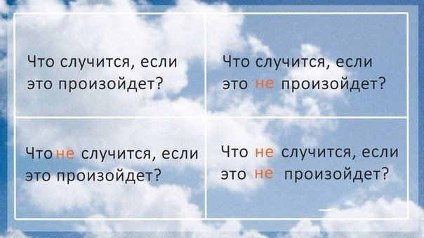 ПОЧЕМУ эта техника работает? «Квадрат Декарта» помогает прояснить последствия каждого решения. Дело в том, что в ситуации, требующей решения, мы часто зацикливаемся на одной позиции: что будет, если это произойдет? С помощью же «квадрата Декарта» мы рассматриваем одну и ту же ситуацию с 4 разных сторон.