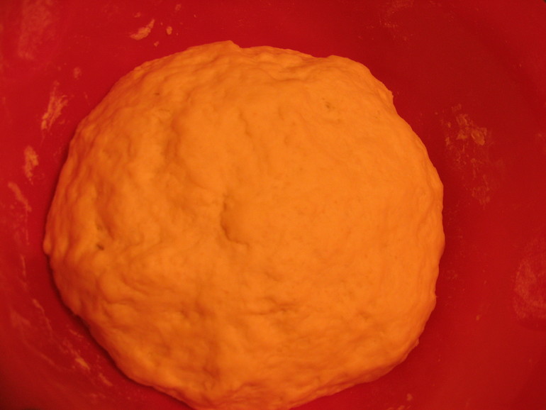 В муку всыпать дрожжи, и порциями выкладываем в жидкость, постепенно замешиваем тесто. Оставляем тесто в тепле на 45-60 минут.