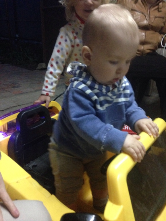 Женя, ко всеобщему изумлению, встал на ножки в детской машинке. К слову, ползать еще не получается, только по-пластунски.