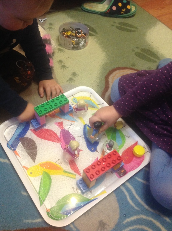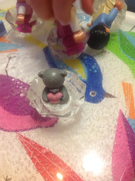 В формочки для льда сажаем разных персонажей и заливаем водой и выносим туда же. Вуаля: недолговечная игрушка готова.