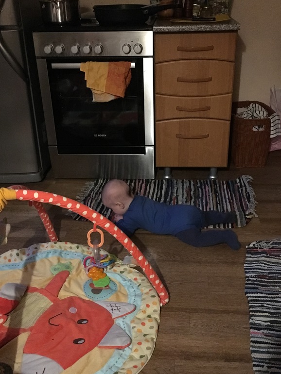 - Переворачивается со спины на живот очень потешно. Неспешно так утыкается мордой в пол, перекатывает попу, пыхтит. Уползает со своего коврика только так. Нашла его давеча жующим кухонный половичок. Хорошо, что я их недавно стирала;