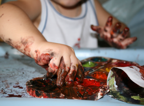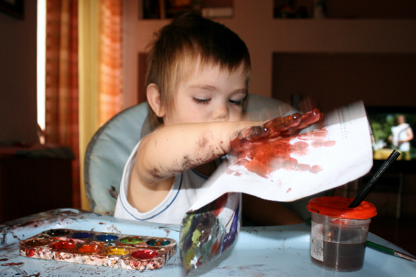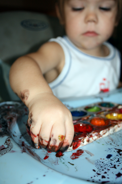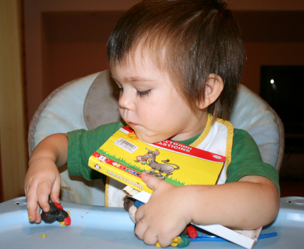 ...так и сидит в обнимку с красками, книгами, карандашами, пластилином, машинками и т.д., при этом тычет в меня пальцем и говоит, что Я "тяться" - жадина!!! Парадокс )!