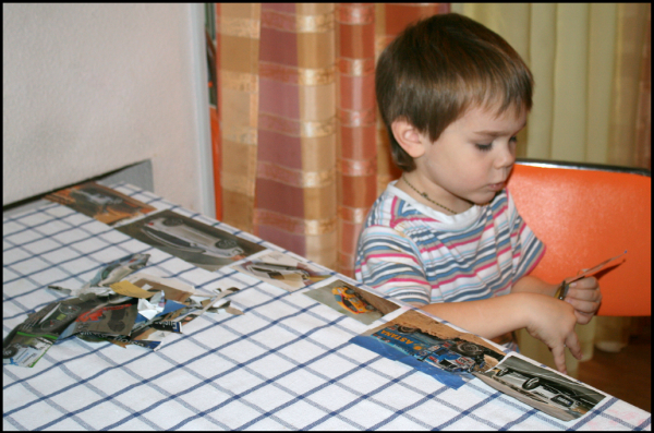 когда совсем нет времени, а деть жаждет творить! можно вырезать заготовки из любого журнала ( у нас кроме автомобильных, которые мы покупали для Вани никаких нет, поэтому в ход идут они) дать в руки ножницы и пусть себе вырезает! Те,что получилось вырезать сравнительно ))) хорошо, приклеиваем в альбом! И он доволен - машины же!!! и я кучу дел переделала! Стоп! а чем у меня младший в это время занят был??? Хмммммм.................наверное..............чем-то!)))