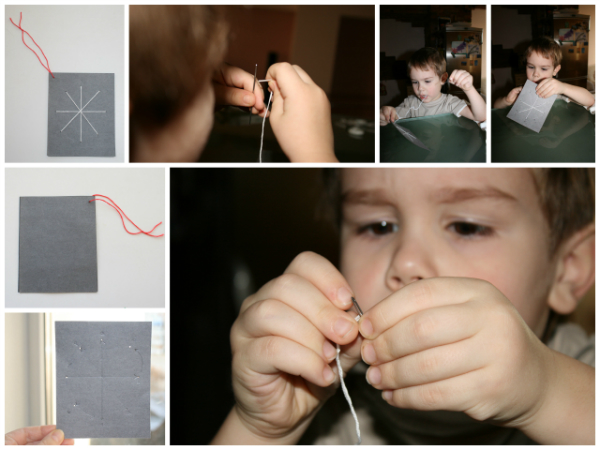 Вышиваем снежинку. Наверняка кто-то тоже делал что-то подобное, но я не видела и это плод моей собственной фантазии. Занятие на развитие логического мышления, т.к. делать нужно четко по схеме - следовать за стрелками, здесь же повторение счета. И, безусловно, моторика! Вставить нитку в иголку невероятно сложно. Много раз он видел, как я что-то подшиваю или шью, поэтому был в восторге от того,что я ему иголку доверила. Убеждал меня еще, что не уколется - смешной)!