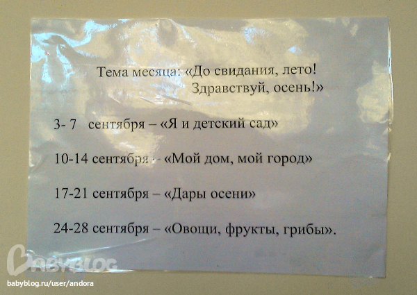 Не очень давно читала у Маши (ссылка на пользователя не вставляется почему-то http://www.babyblog.ru/user/Amarei/3027500 ) пост о том, как построена система обучения в школе, очень мне тогда понравилось то,что родители всегда знают чем занимаются дети в течении дня - недели - месяца. Потому что у нас воспиталки партизанят,а из ребенка нифига не вытянешь. И случилось на прошлой неделе очень долгое и нудное род. собрание, на котором из кучи белеберды про деньги, единственным полезным стало то, что в этом учебном году на каждую неделю будет даваться определенная тема, а список будет висеть на всеобщем обозрении в раздевалке. И расписание кружковых занятий тоже теперь доступно.