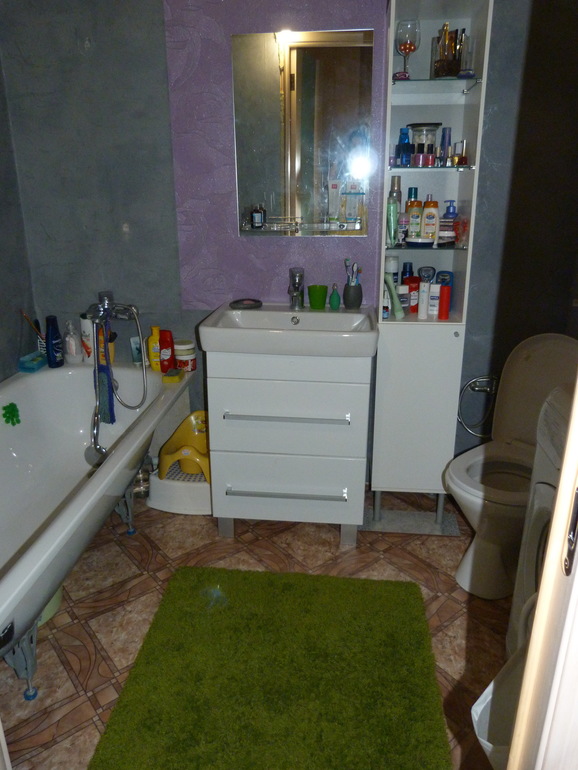 Ванна совмещена с туалетом. Отделки там ни какой не было..Мы уже сами купили ленолиум и постелили, чтобы можно было притереть тряпкой.. Так как штукатурка, только способствует растаскиванию песка..