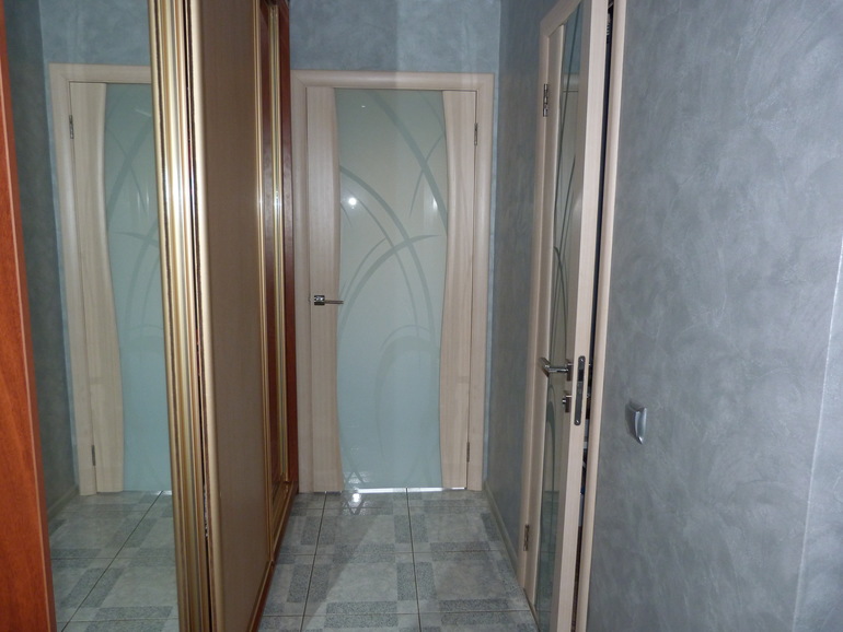 Проходим направо. Стоит наш шкаф и далее 2 двери в комнату и в санузел.